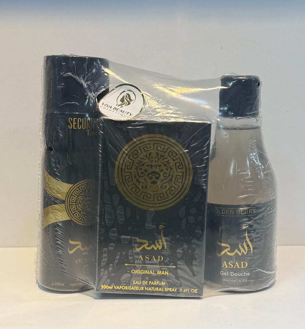 | ASAD EAU DE PARFUM | Vaporisateur Naturel Spray | 100 ml (3.4 Fl. Oz) | Parfum concentré, pièce maîtresse du coffret. Mentionne « ORIGINAL MAN ». |